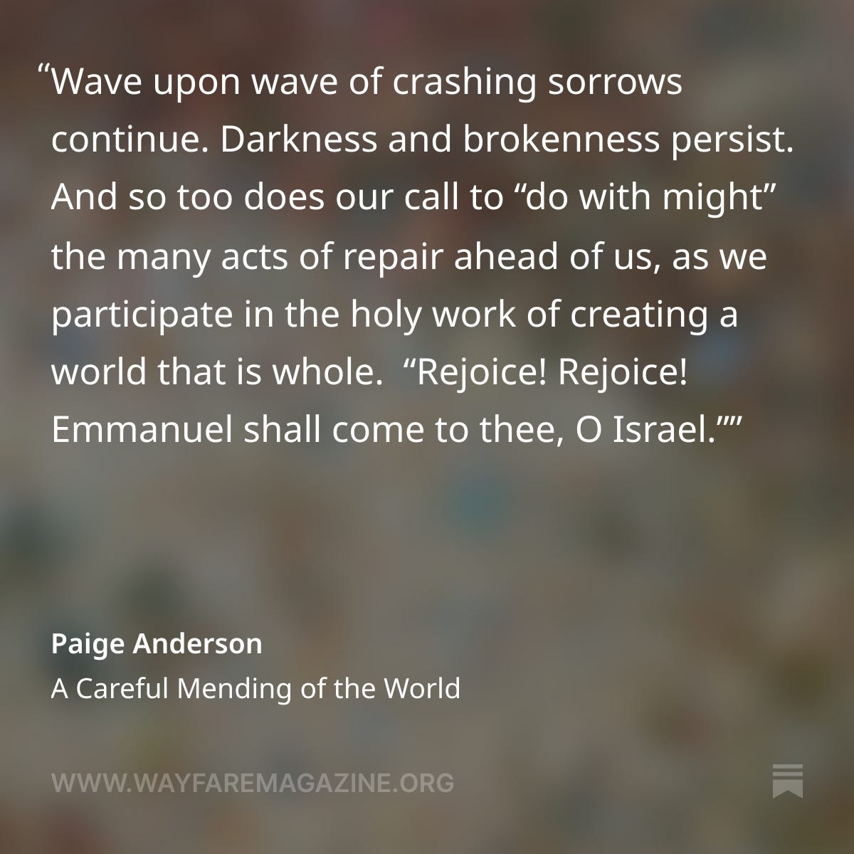 Cece helps us see that Advent prepares us for the joy of Christ’s coming, not by turning away from the hard and the real, but by teaching us to stay with it. In that presence, something holy unfolds. And maybe most beautifully, she reminds us that we are part of this unfolding—that Christ comes not only to us in this season, but through us. Through our love, our creativity, we join in the work of “hasten[ing] the time” of peace on earth, goodwill toward men.