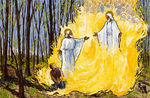 And it was a dangerous journey. As soon as Joseph begins to pray he is assailed by a malevolent energy bent on his annihilation, but which is soon dispatched with the coming of the Fire from Heaven, which descends slowly and deliberately to earth in the shape of a pillar. So intense was the descending light that Joseph feared lest the trees enveloped by the fire should be consumed by the flames and marveled that they were not.((“Appendix: Orson Pratt, A[n] Interesting Account of Several Remarkable Visions, 1840,” p. 5, The Joseph Smith Papers)) Instead, Joseph and the surrounding wood are embraced by a fire that burned brightly but did not consume, reminiscent of a similar event at the beginning of Exodus.