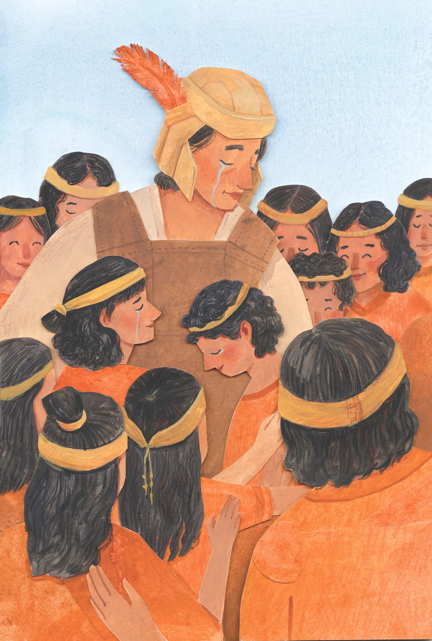 And Helaman turned back and looked out, and his heart sank. They were just boys. They were too young to be married, too young to own a house, too young to fight a war. But the army needed soldiers. So Helaman bowed his head and said, “Yes. You can fight in your father’s place. But only if I can be your captain.” Then he looked at the mothers of the boys. They were smiling with pride, but they were also crying. Helaman looked into their tearful eyes and said, “I will bring them back alive.”