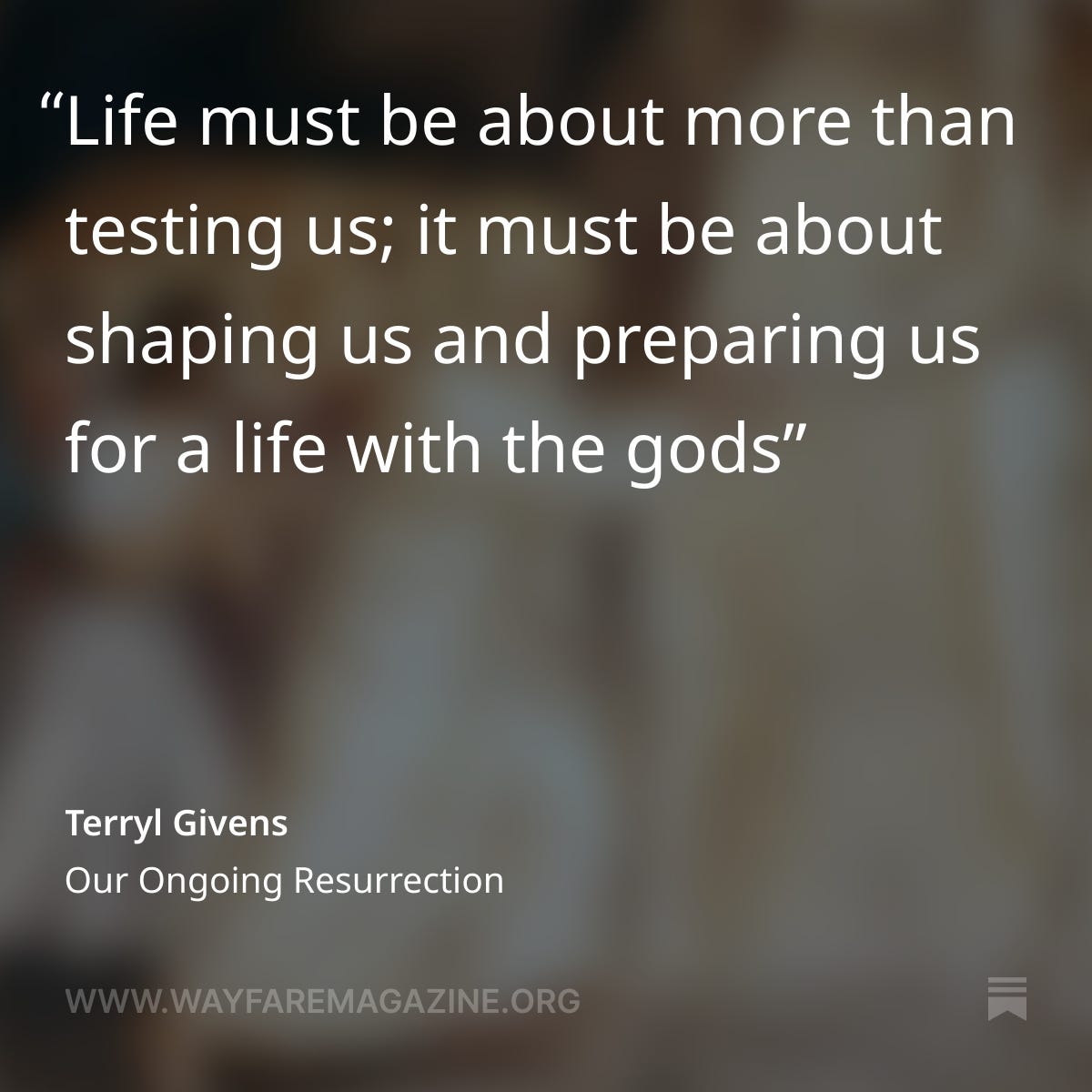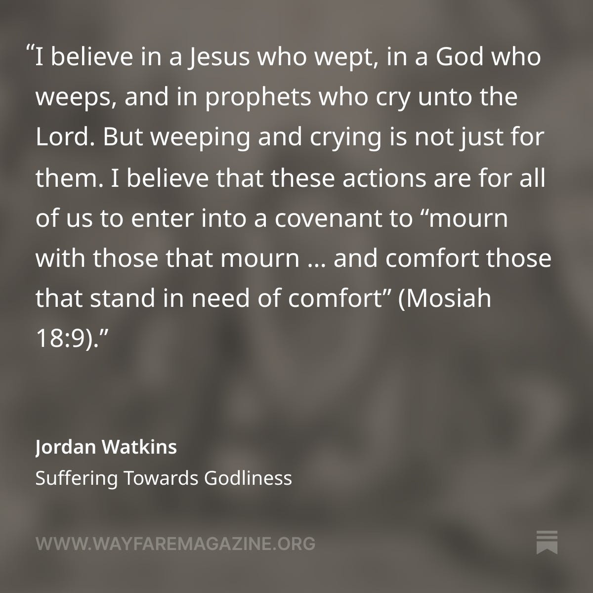 I believe that the Son and the Father weep because they refuse to look away from evil. They choose to share in our suffering. When Enoch questioned the Father for weeping, the Father asked him to look, really look, at man’s inhumanity to man. And Enoch “looked upon [the people’s] wickedness, and their misery, and wept” (Moses 7:41). Enoch had been preoccupied with the salvation of his own community. So preoccupied, in fact, that he had succeeded in creating a Zion that God had lifted into heaven. Enoch’s efforts had raised the living. But the Father had to remind him of those who had been left behind, of those who still suffered down in the dirt. In the process, Enoch learned that God’s life was not a life without suffering, because God’s love was not confined to those who loved him. He realized that to love like God meant to suffer like God.