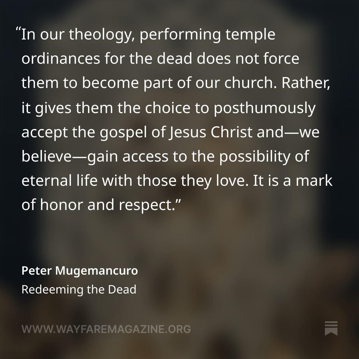 A disposition toward choice is fundamental to Mormonism, for ourselves and for others, “let them worship how, where, or what they may.” It permeates our practices from youth-led programming for children and youth, invitation-led missionary work, relative anonymity in temple attendance, and even our historic skepticism of the federal government, from Missouri mobs to the cowboy libertarians of rural Utah.