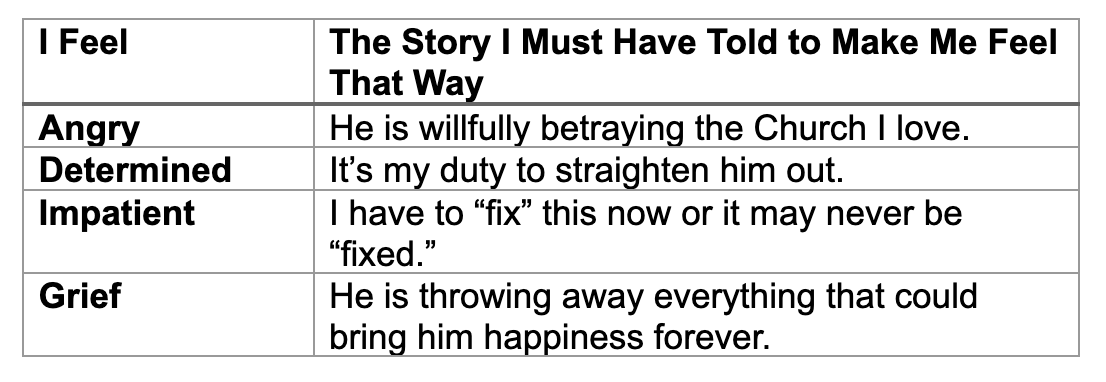 As a trained therapist, Tad had the presence that evening to reflect on what he had done. He took time to name and feel. He teased apart his turbulent stew of emotions. As he named them, he asked himself “What story must I have told myself to make me feel that way?” With some effort, he discerned the stories that had taken him to such an unproductive emotional place.