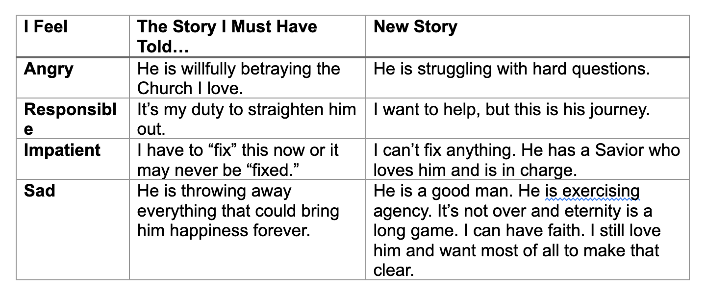 Your only hope of finding peace is to find your way to a peaceful story. Let me be clear: I am not suggesting you must be ambivalent about someone’s loss of faith! I’m simply suggesting that there is a way of holding what is happening that allows you to show up with love and faith. Our Father in Heaven can. The Savior can. With their help so can you. The path to that place involves identifying and fixing errors in your story.