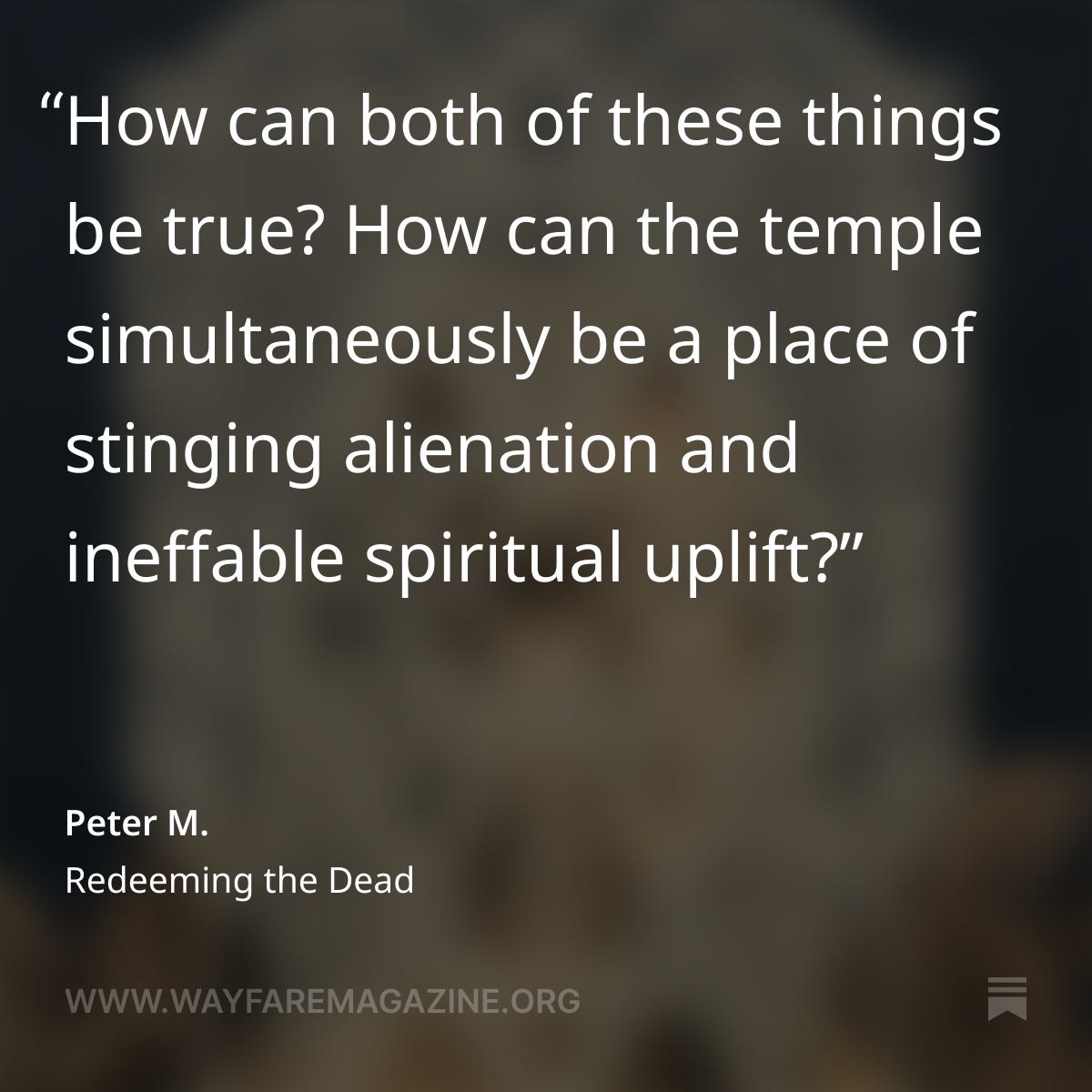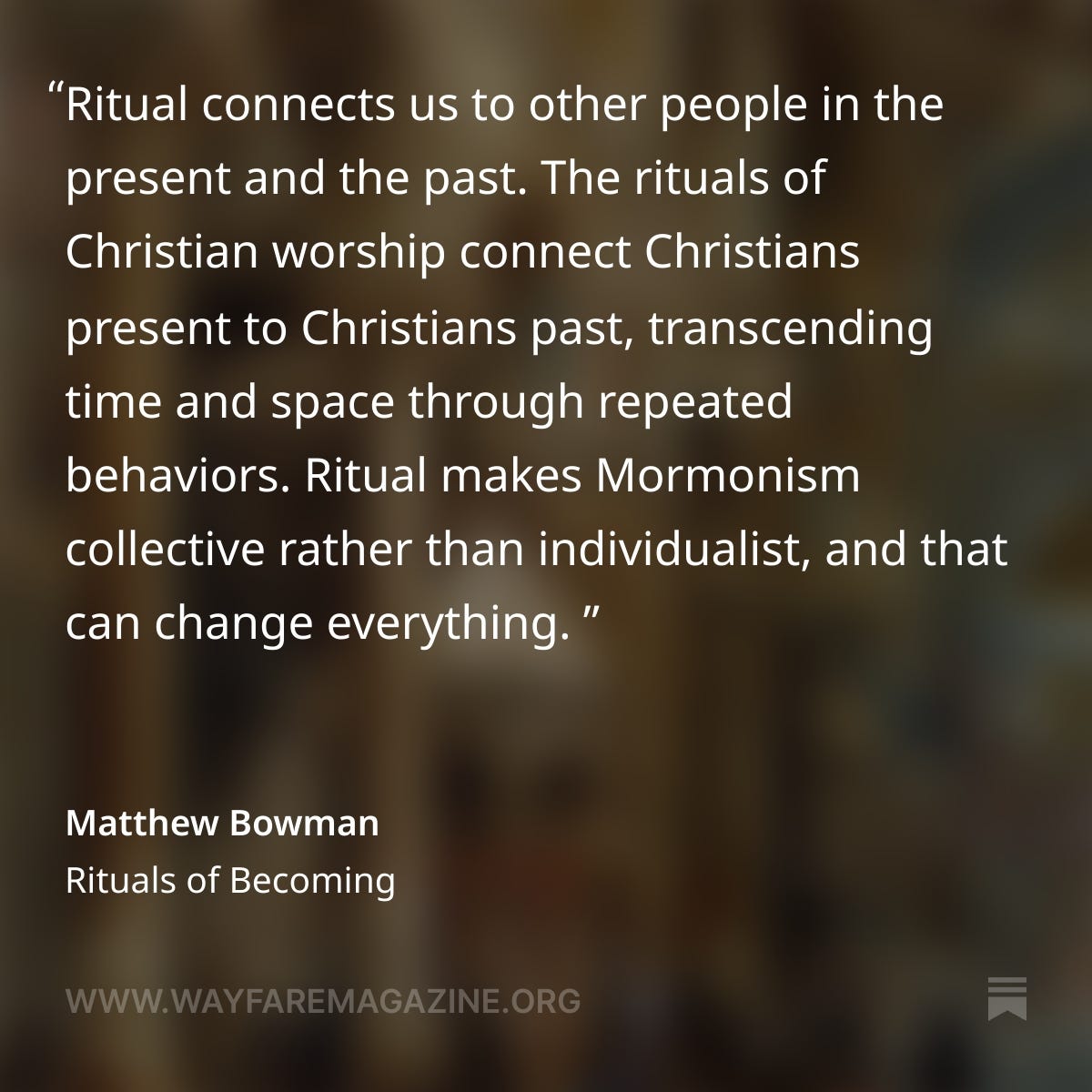 The rituals of Latter-day Saint worship, I think, point us in this direction. They don’t exist to give us information that we need to better fulfill a contract. Instead, they invite us to behave as though we are always already in relationships in which we give to each other out of care and kinship.