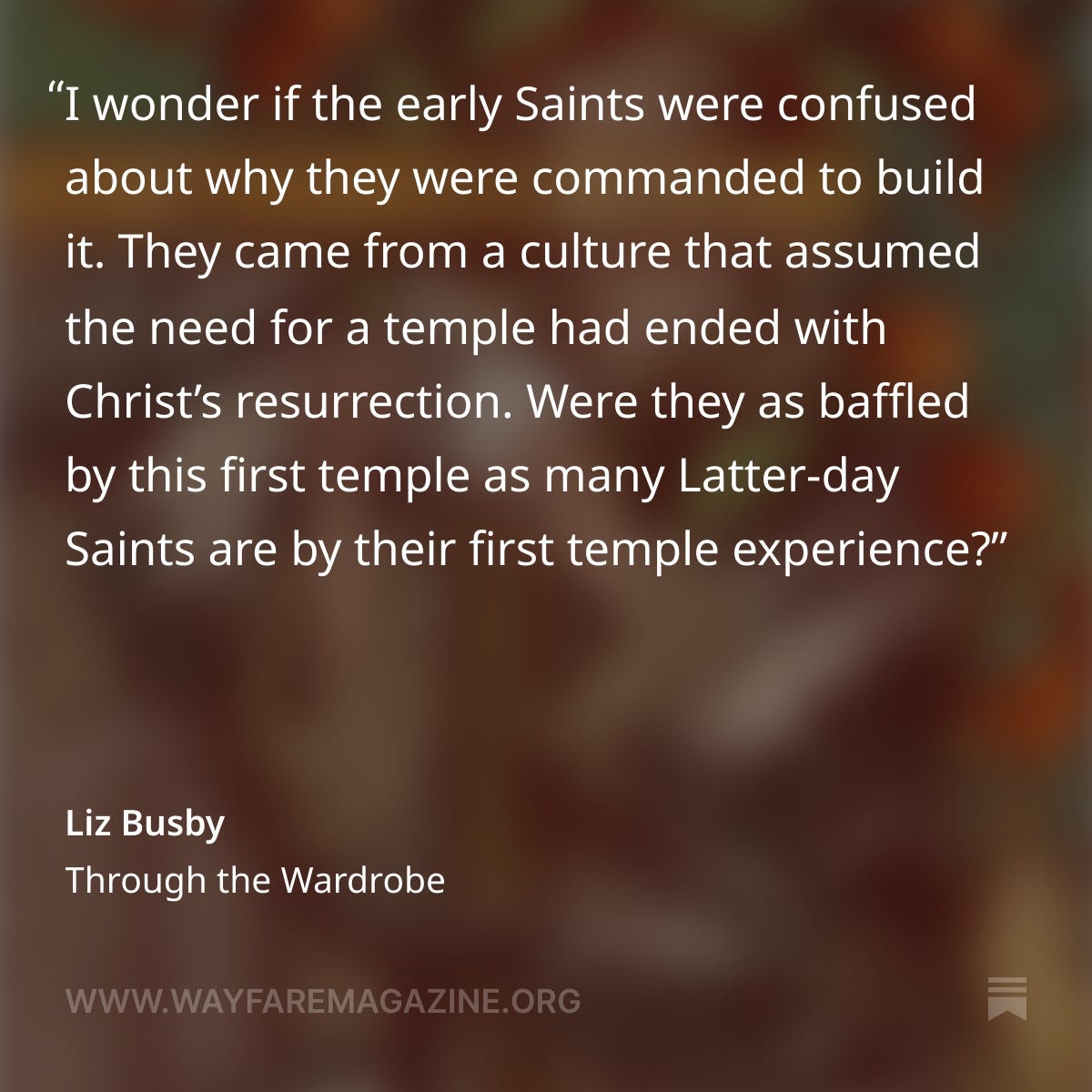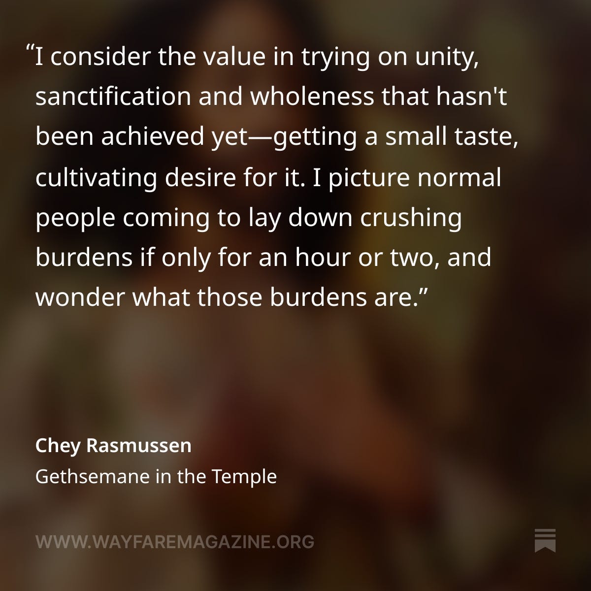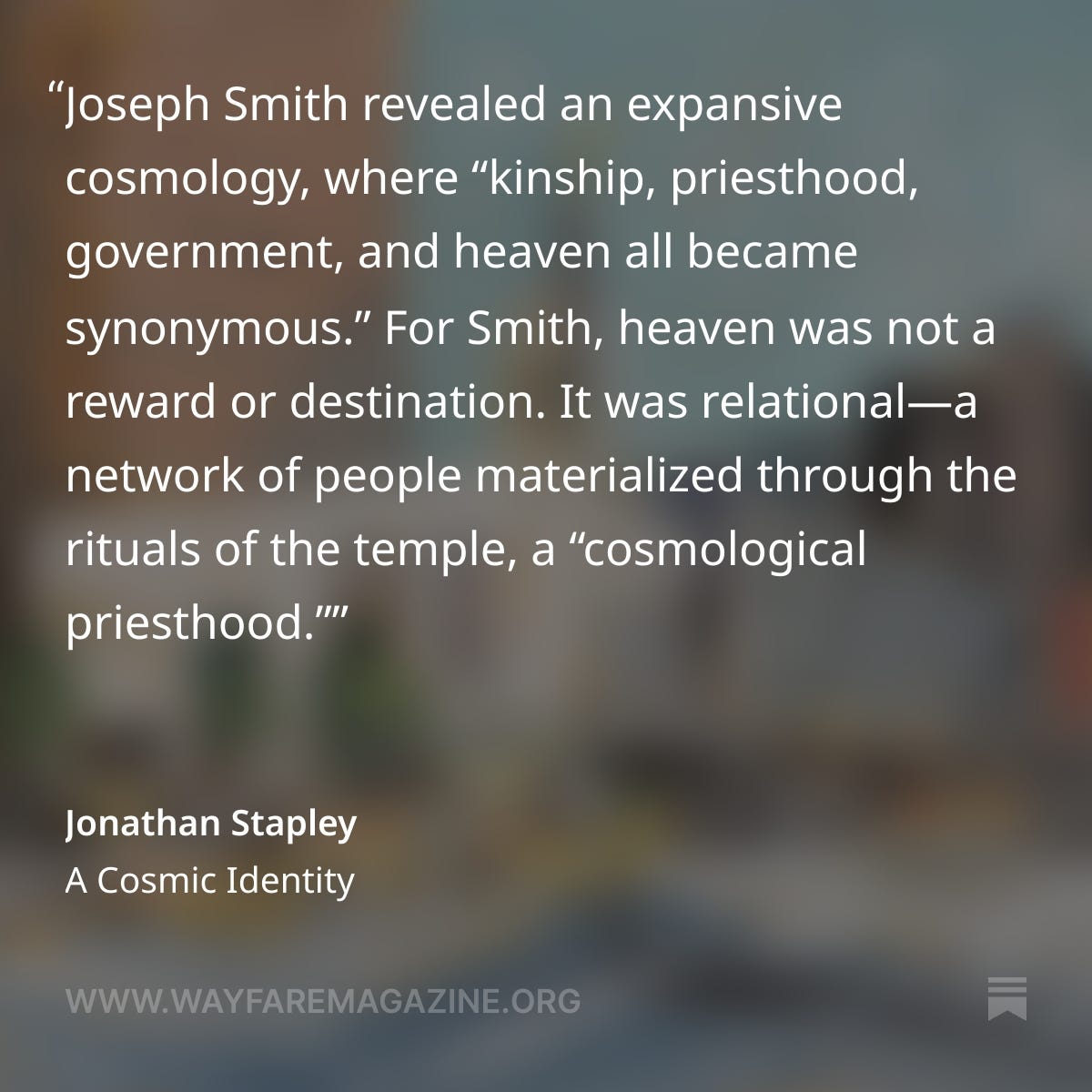 In this way, covenants matter not primarily because they constitute a checklist that helps us prepare for the afterlife, nor primarily because they are required stops on the road that allow us to return to heaven, but, instead, because they transform us, not just individually but also collectively